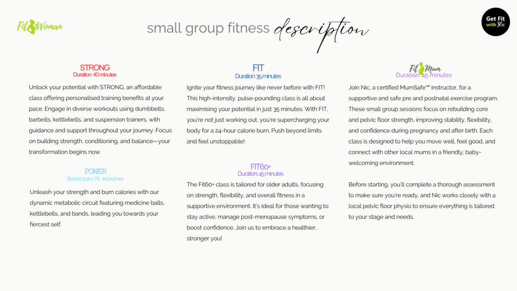 At Get Fit With Nic, we do things differently. I run small group strength training sessions designed specifically for women in midlife. This isn’t bootcamp. It’s not punishment. And it’s not about shrinking yourself.